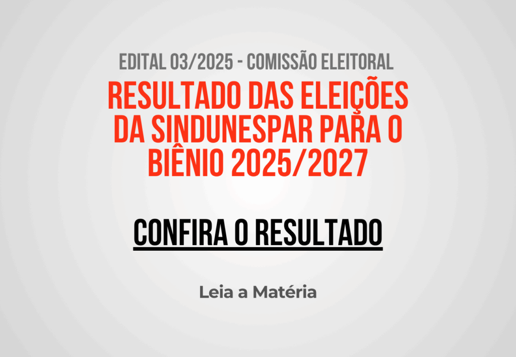 Edital 03/2025 – Comissão Eleitoral RESULTADO DAS ELEIÇÕES DA SINDUNESPAR PARA O BIÊNIO 2025/2027 A Comissão Eleitoral da SINDUNESPAR para eleição do biênio 2025-2027, no uso de suas atribuições Regimentais, resolve divulgar a apuração da votação realizada no dia 01 de outubro de 2025, e que tem o seguinte resultado: Chapa: Autonomia e Unidade Sindical […]