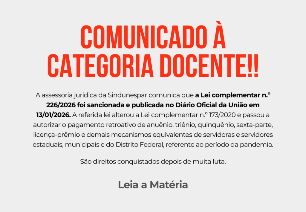 A assessoria jurídica da Sindunespar comunica que a Lei complementar n.º 226/2026 foi sancionada e publicada no Diário Oficial da União em 13/01/2026. A referida lei alterou a Lei complementar n.º 173/2020 e passou a autorizar o pagamento retroativo de anuênio, triênio, quinquênio, sexta-parte, licença-prêmio e demais mecanismos equivalentes de servidoras e servidores estaduais, municipais […]