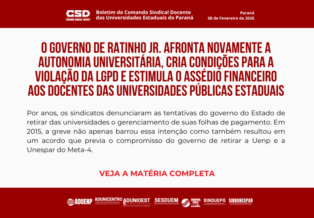 O Governo de Ratinho Jr. afronta novamente a autonomia universitária, cria condições para a violação da LGPD e estimula o assédio financeiro aos docentes das universidades públicas estaduais