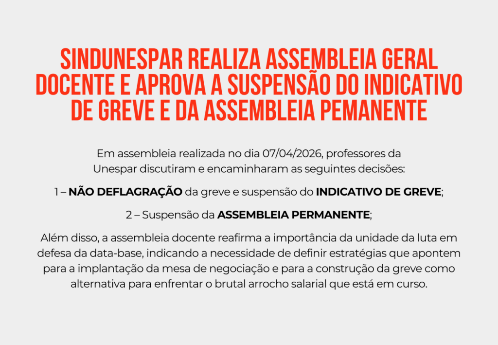 Em assembleia realizada no dia 07/04/2026, professores da Unespar discutiram e encaminharam as seguintes decisões: 1 – NÃO DEFLAGRAÇÃO da greve e suspensão do INDICATIVO DE GREVE; 2 – Suspensão da ASSEMBLEIA PERMANENTE; Além disso, a assembleia docente reafirma a importância da unidade da luta em defesa da data-base, indicando a necessidade de definir estratégias […]