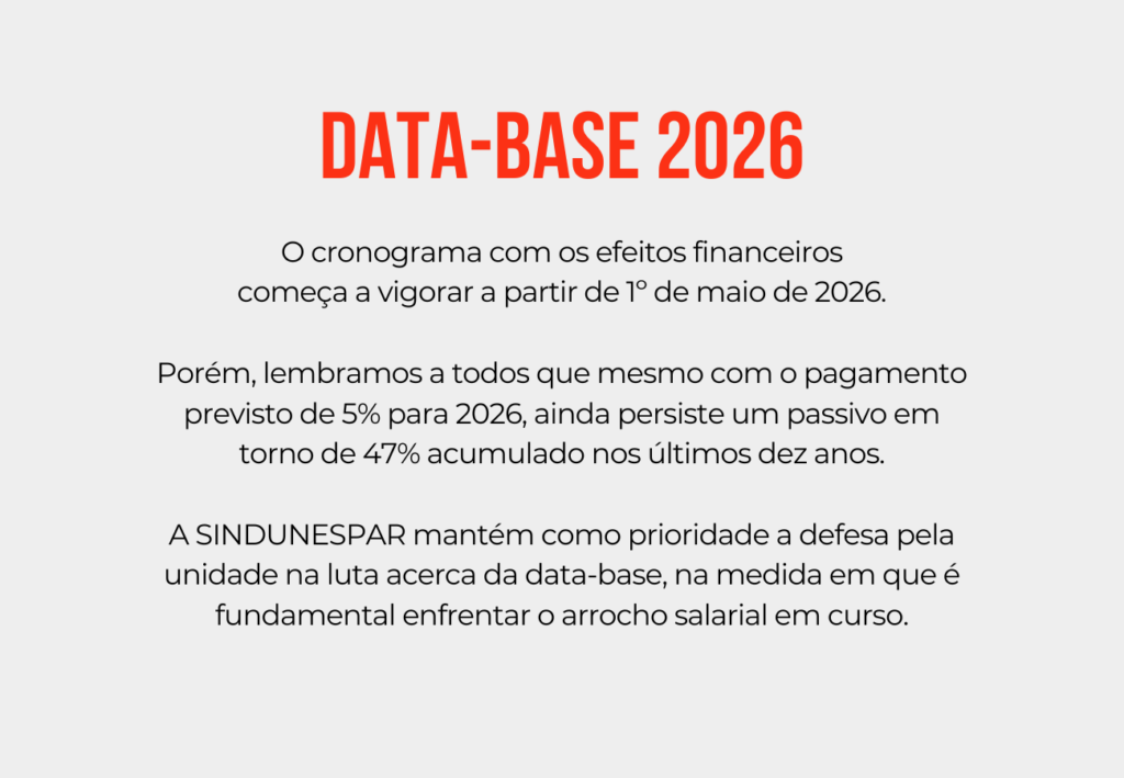 Informamos aos Docentes da UNESPAR que a recomposição salarial referente à data-base 2026 está em andamento. O objetivo principal da data-base é repor a inflação acumulada no período e garantir a manutenção do poder de compra do trabalhador. A recomposição da inflação em 2026 será de 5% incidentes sobre os vencimentos de carreira, auxílio-alimentação e […]