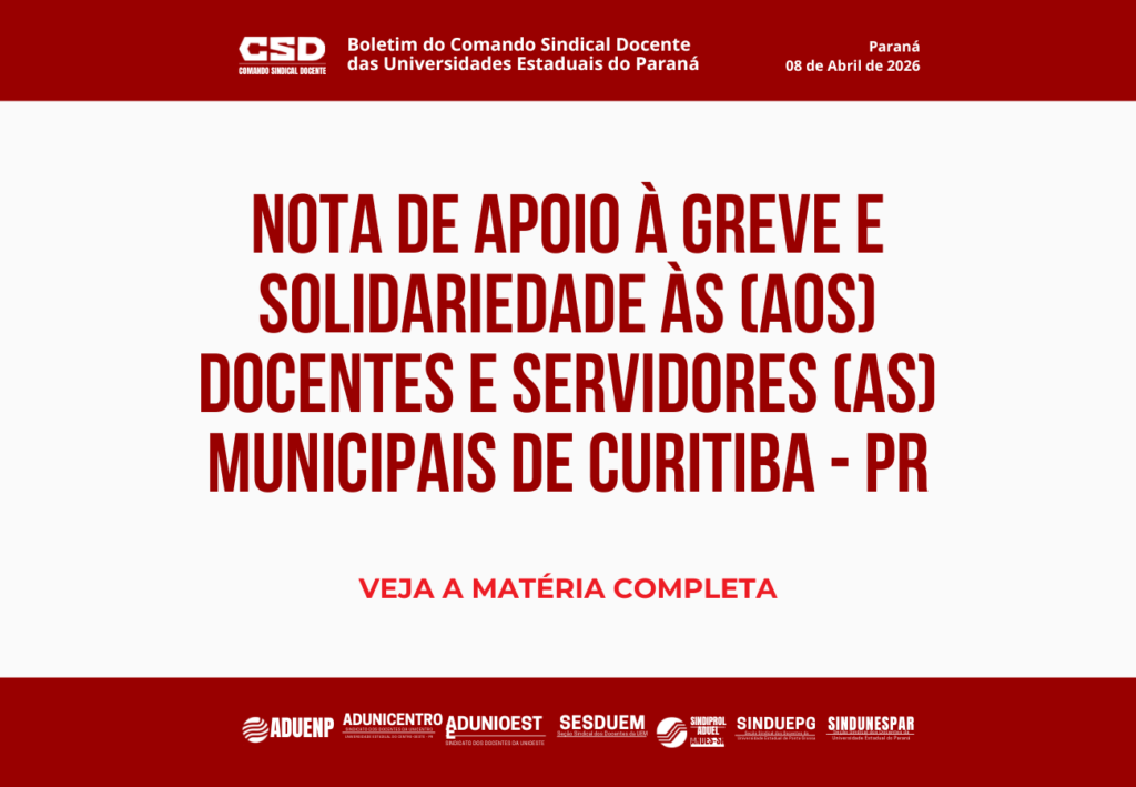 O CSD – Comando Sindical Docente, constituído pelas sete seções sindicais do ANDES-SN, as quais representam docentes das universidades estaduais do PR, manifesta apoio à greve e solidariedade às (aos) docentes e servidores(as) municipais de Curitiba, sob a gestão de Eduardo Pimentel (PSD). A greve é um instrumento legal e legítimo de luta de trabalhadoras(es) […]