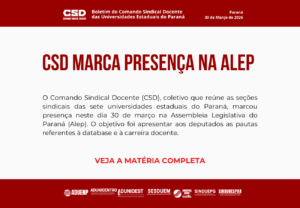 A diretoria da Sindunespar (Seção Sindical dos Docentes da Unespar) convocou para a próxima sexta-feira, dia 27 de outubro, com primeira chamada às 14h a Assembleia Geral dos Docentes.