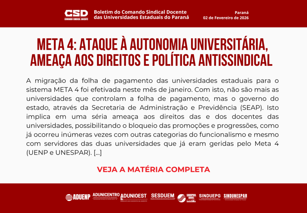 Por anos, os sindicatos denunciaram as tentativas do governo do Estado de retirar das universidades o gerenciamento de suas folhas de pagamento. Em 2015, a greve não apenas barrou essa intenção como também resultou em um acordo que previa o compromisso do governo de retirar a Uenp e a Unespar do Meta-4. Nos anos subsequentes, […]