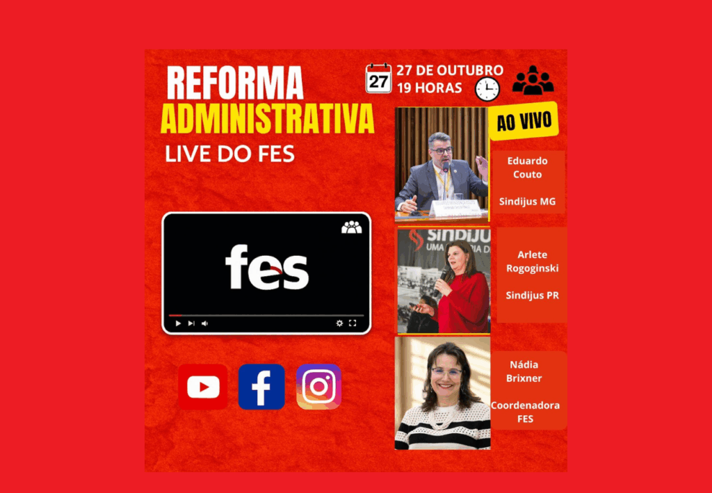 Nesta segunda, 27 de outubro, às 19h, o FES promove uma live sobre os riscos da Reforma Administrativa que ameaça o serviço público e os direitos dos trabalhadores. Participam Eduardo Couto (Sindijus MG), Arlete Rogoginski (Sindijus PR) e Nádia Brixner (APP-Sindicato). Assista ao vivo no YouTube e Facebook do FES e fortaleça essa luta em […]