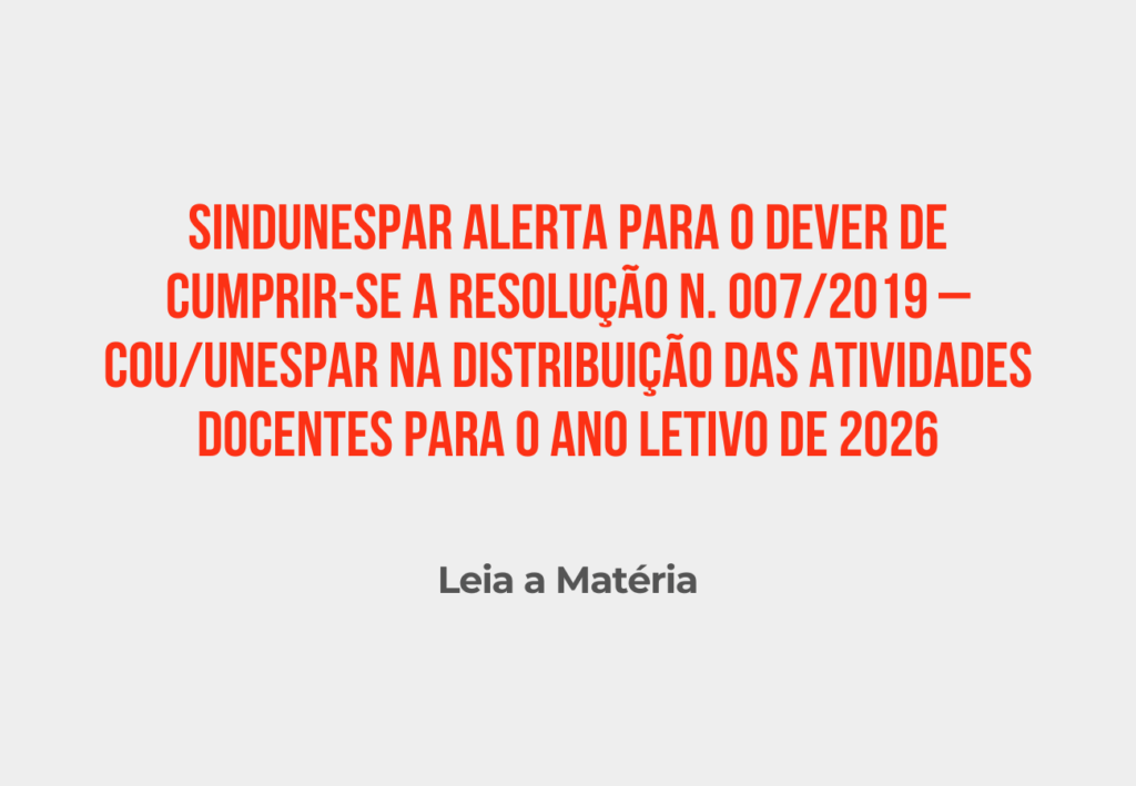 Sindunespar alerta para o dever de cumprir-se a resolução N. 007/2019 – COU/Unespar na distribuição das atividades docentes para o ano letivo de 2026