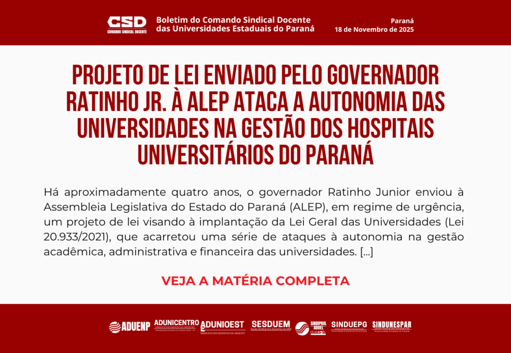 Há aproximadamente quatro anos, o governador Ratinho Junior enviou à Assembleia Legislativa do Estado do Paraná (ALEP), em regime de urgência, um projeto de lei visando à implantação da Lei Geral das Universidades (Lei 20.933/2021), que acarretou uma série de ataques à autonomia na gestão acadêmica, administrativa e financeira das universidades. No dia de ontem […]