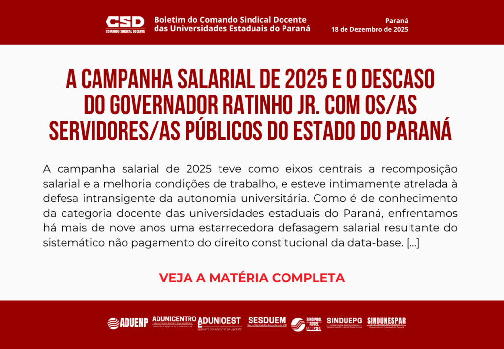 A campanha salarial de 2025 teve como eixos centrais a recomposição salarial e a melhoria condições de trabalho, e esteve intimamente atrelada à defesa intransigente da autonomia universitária. Como é de conhecimento da categoria docente das universidades estaduais do Paraná, enfrentamos há mais de nove anos uma estarrecedora defasagem salarial resultante do sistemático não pagamento […]