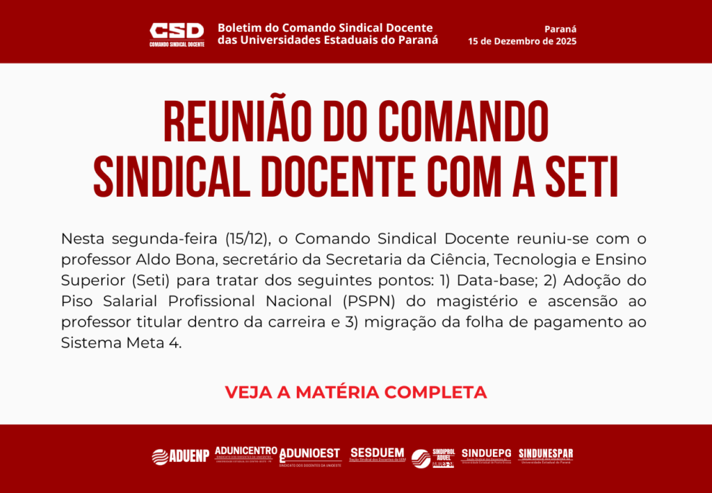 Nesta segunda-feira (15/12), o Comando Sindical Docente reuniu-se com o professor Aldo Bona, secretário da Secretaria da Ciência, Tecnologia e Ensino Superior (Seti) para tratar dos seguintes pontos: 1) Data-base; 2) Adoção do Piso Salarial Profissional Nacional (PSPN) do magistério e ascensão ao professor titular dentro da carreira e 3) migração da folha de pagamento […]