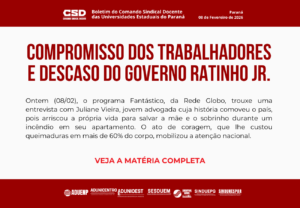 O que a matéria jornalística também revelou é a importância dos hospitais universitários estaduais para a população do estado do Paraná. Foi em dois deles, HU da Unioeste e HU da UEL, que Juliane recebeu atendimento especializado, realizado por equipes altamente qualificadas, comprometidas e reconhecidas pela excelência técnica. Esses profissionais, assim como os docentes e demais trabalhadores das universidades estaduais, sustentam diariamente serviços essenciais à população, mesmo diante de condições adversas.