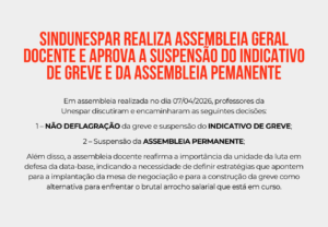 – Nós já estamos sentindo na pele a retirada de nossos direitos. Como a Unespar está no META 4, a sua folha de pagamento é controlada pela SEAP/SEFA. São elas que definem, em última instância, o que se paga ou não nos nossos rendimentos. Através desse controle, professores e agentes já estão sofrendo com a restrição aos seus direitos de progressão e promoção na carreira.