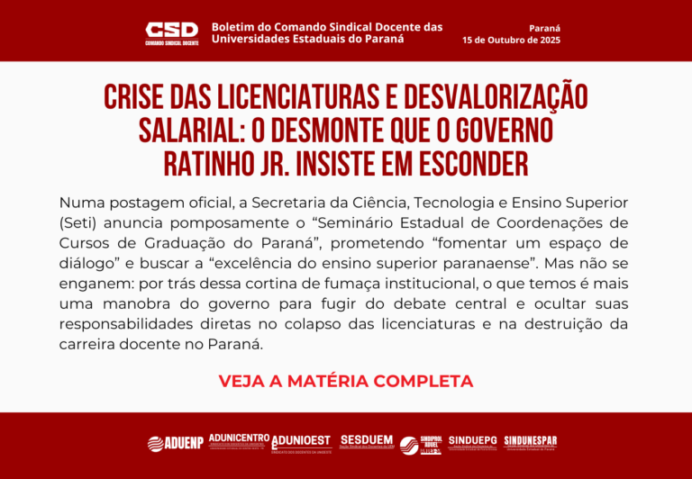 A Sindunespar, como representante dos docentes da Universidade Estadual do Paraná (Unespar), é a voz unificada que defende os interesses e direitos da comunidade acadêmica nos diversos campi. Afiliado ao ANDES-SN, comprometemo-nos fervorosamente com a valorização profissional e a garantia da qualidade do ensino superior público. Junte-se a causa e fortaleça a luta!